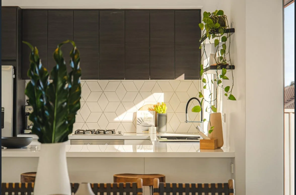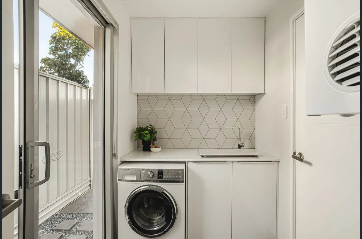 The kitchen is beautifully appointed and enjoys an elevated outlook down the driveway towards Eric Singleton Bird Sanctuary, bringing a lovely sense of openness into the home. Finished with stone benchtops and generous storage, the kitchen connects seamlessly to the laundry, which functions perfectly as an extension of the space, much like a practical scullery.