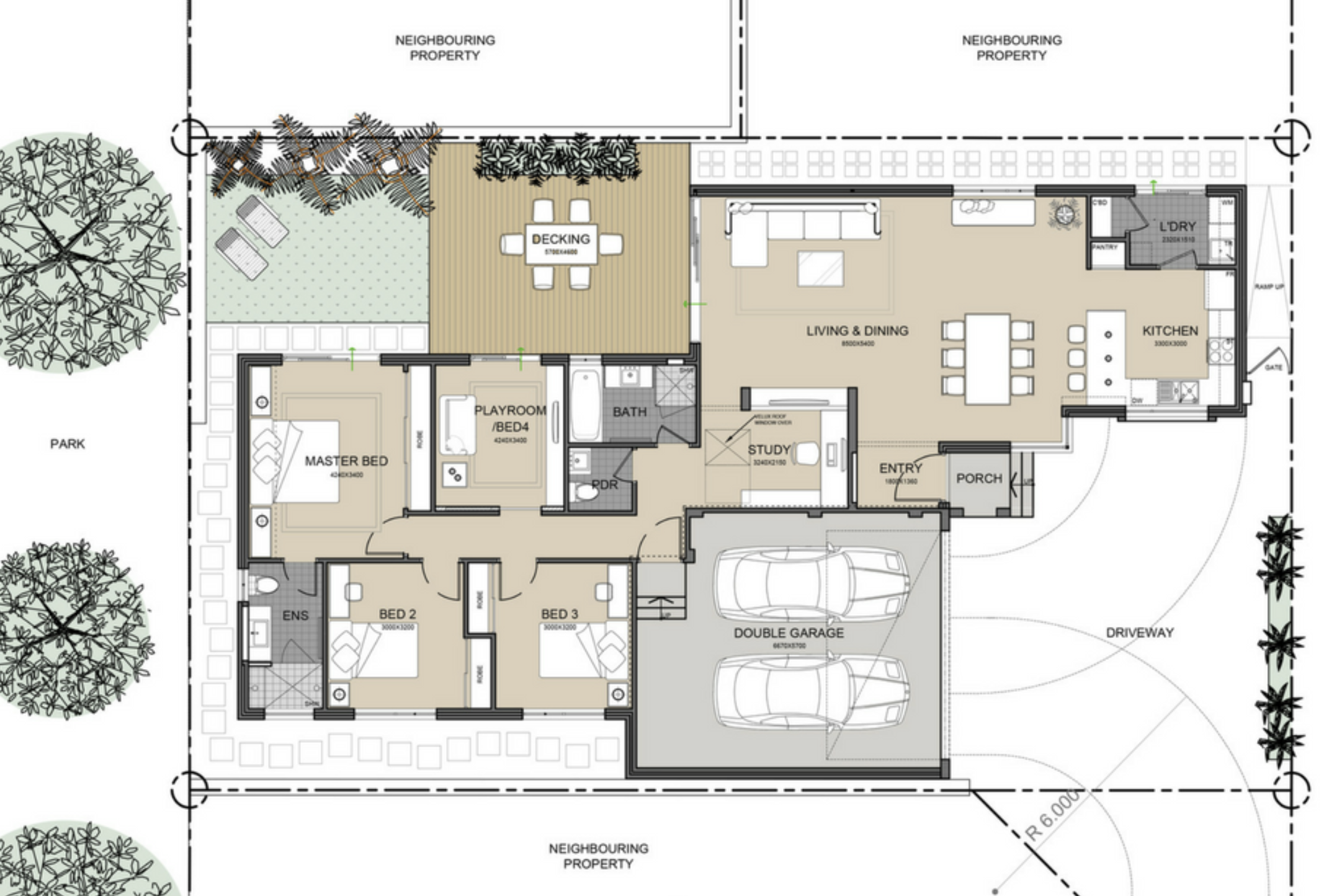 We developed this smart family house with two zones; the quiet zone - bedroom wing and open plan living area, both with strong access to the outdoor decks and garden.